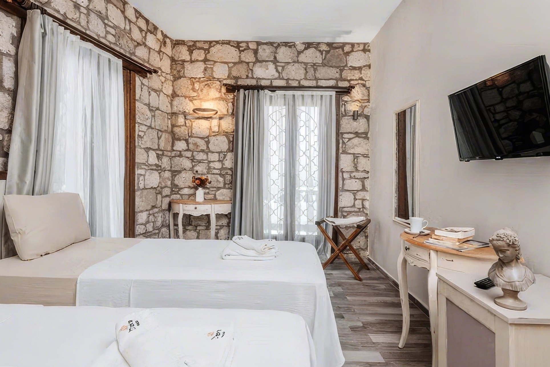 Odada çift yatak veya iki ayrı tek yatak seçeneği bulunur. Özel banyo, tuvalet ve lavabo alanı, günlük ihtiyaçları karşılayacak şekilde düzenlenmiştir. Doğal ışık alan oda yapısı, konaklama süresince rahat ve dengeli bir ortam sağlar.